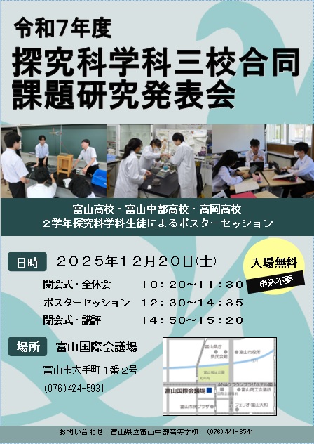2025年12月5日 / 最終更新日時 : 2025年12月5日 AYAKO KAJIKAWA SSH 令和7年度 三校合同課題研究発表会のご案内 令和7年12月20日(土)に富山国際会議場で、 富山高等学校、高岡高等学校、富山中部高等学校 探究科学科2学年生徒による、 三校合同課題研究発表会を実施致します。 お問い合わせは下記の電話番号までお願いします。 富山中部高校 (076)441-3541