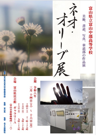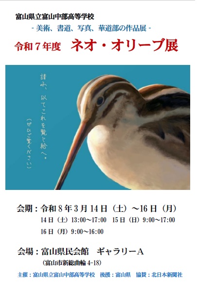 2026年3月9日 / 最終更新日時 : 2026年3月9日 AYAKO KAJIKAWA お知らせ 令和7年度ネオ・オリーブ展の開催について 美術部、書道部、写真部、華道部の作品発表を行います。 ぜひ一年間の活動の成果をご高覧ください。 会期 3月14日(土) 13時~17時 3月15日(日) 9時~17時 3月16日(月) 9時~16時 会場 富山県民会館 ギャラリーA(富山市新総曲輪4-18)